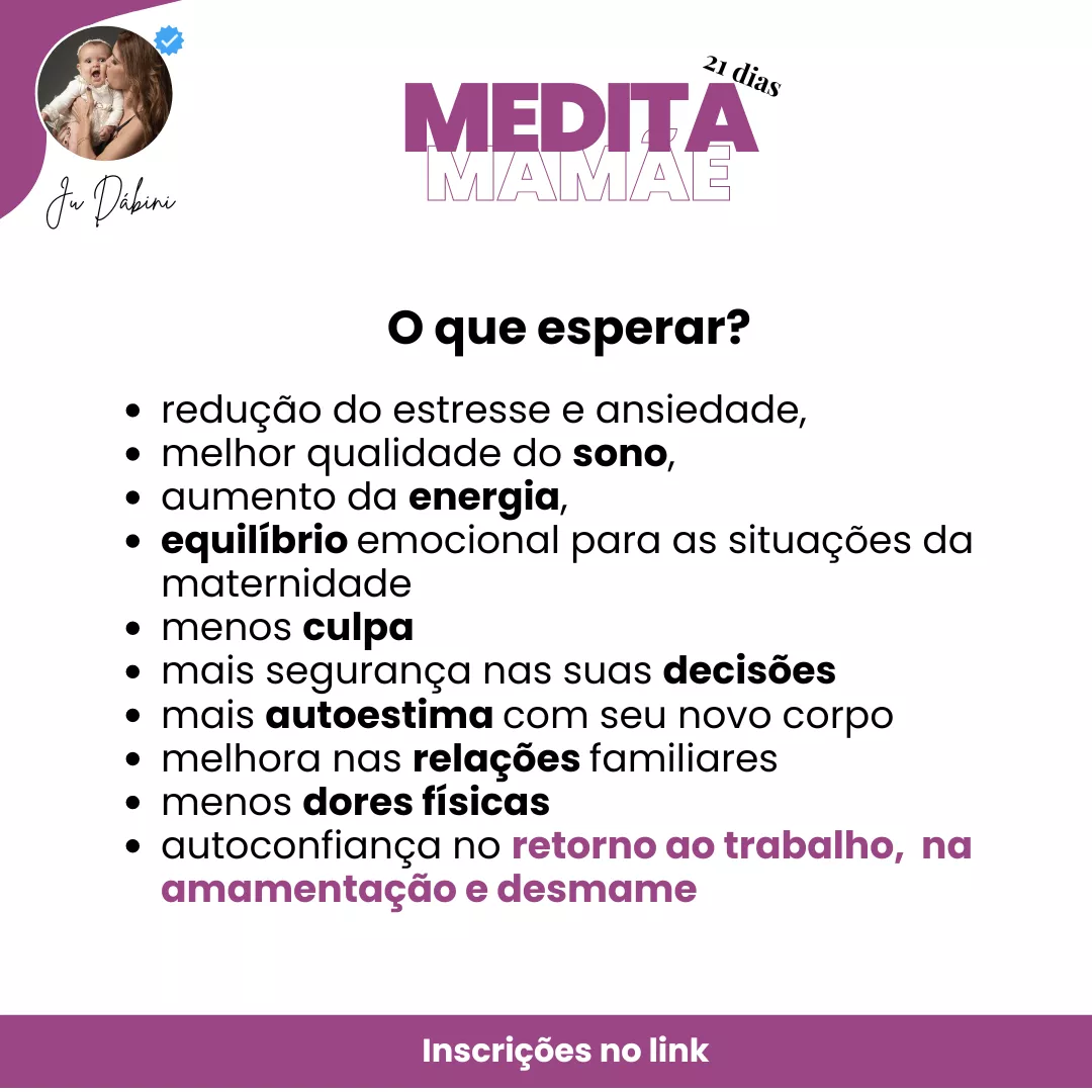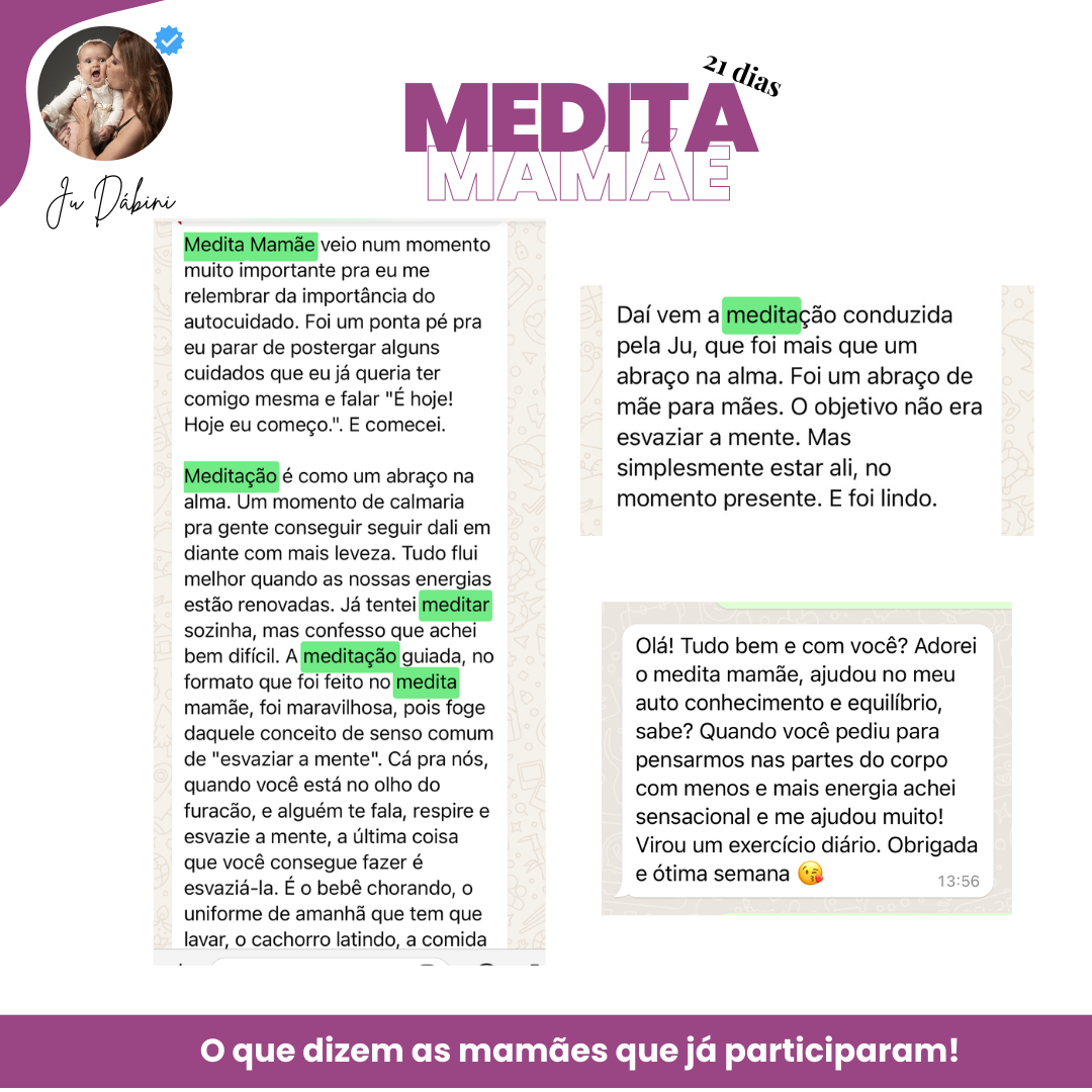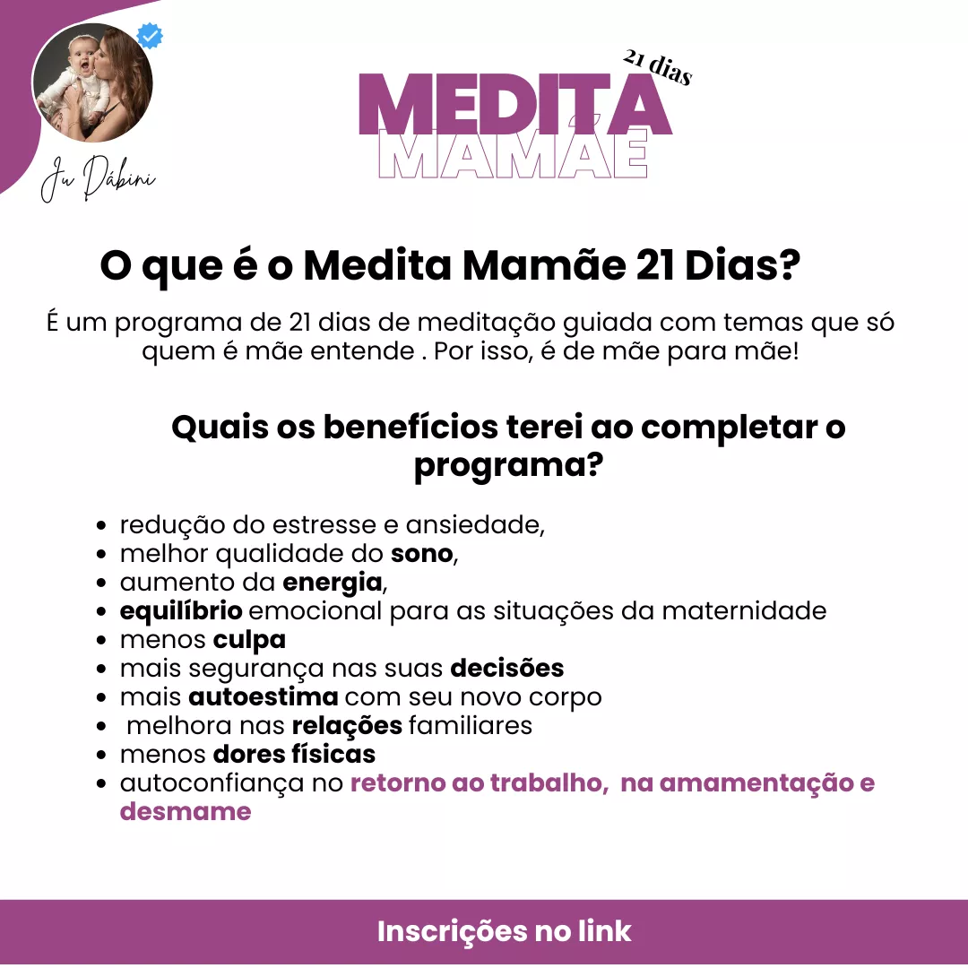 Com o Medita Mamãe: 21 Dias para Despertar sua Maternidade +Leve, descubra a jornada de transformação e empoderamento para mães. Encontre paz no dia a dia, fortaleça o vínculo com seu bebê, gerencie suas emoções e junte-se à comunidade de apoio. Comece a sua jornada de autocuidado e equilíbrio emocional agora.